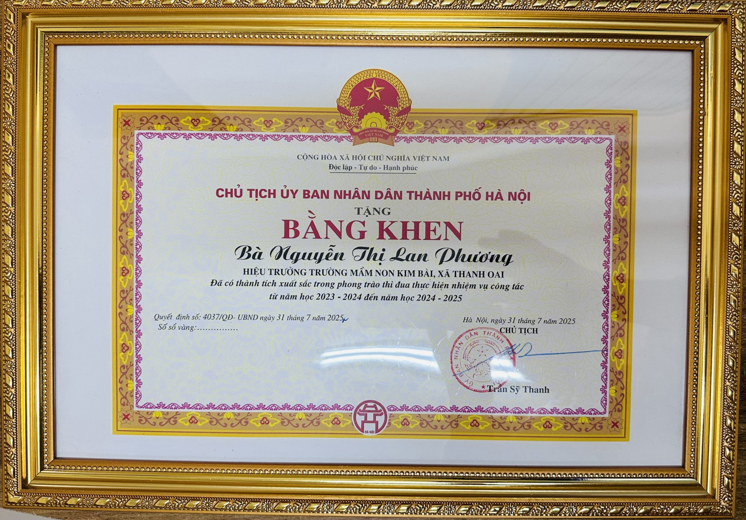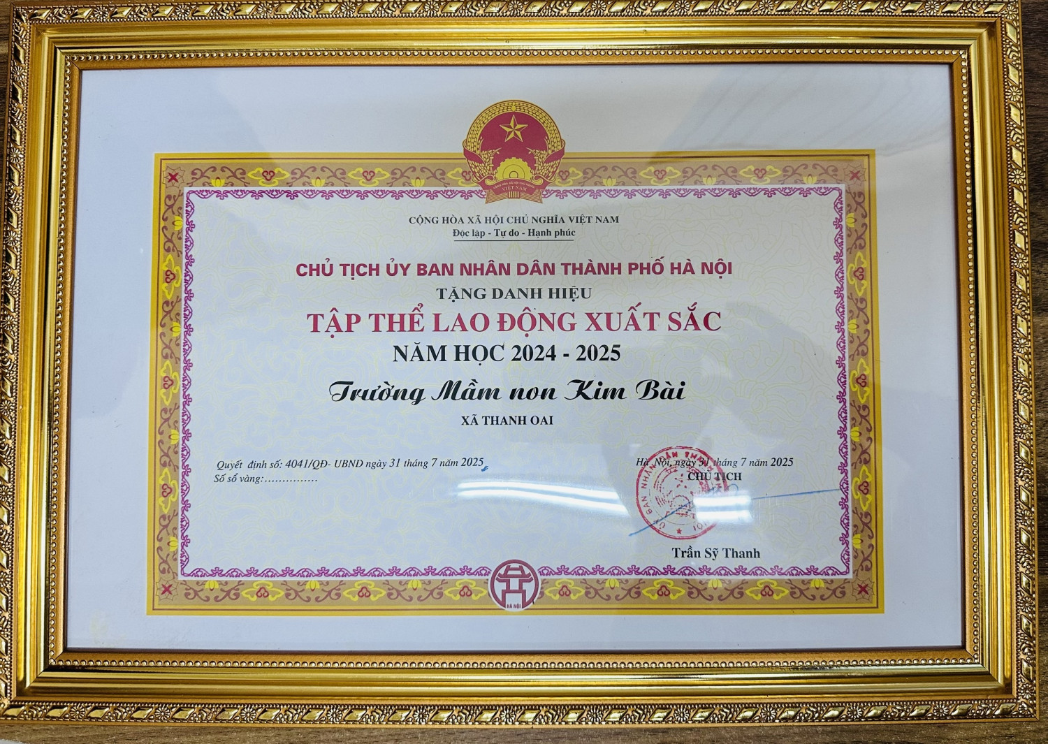 Tại buổi lễ, Trường Mầm non Kim Bài vô cùng tự hào khi được vinh danh với danh hiệu “Tập thể Lao động xuất sắc”. Thành tích này ghi nhận sự nỗ lực bền bỉ, tinh thần đoàn kết và trách nhiệm của toàn thể cán bộ, giáo viên, nhân viên nhà trường trong suốt thời gian qua.