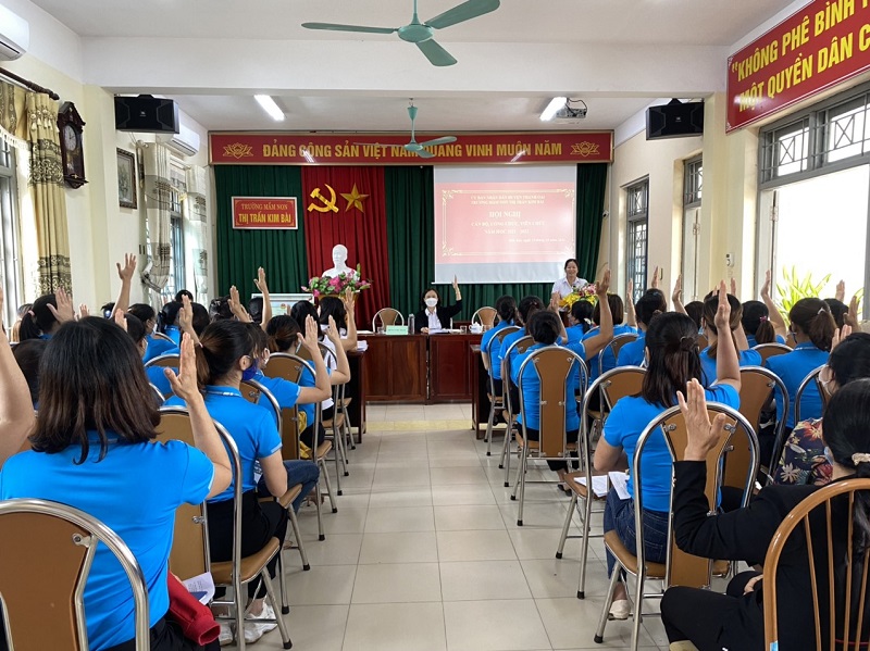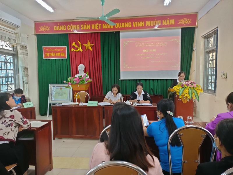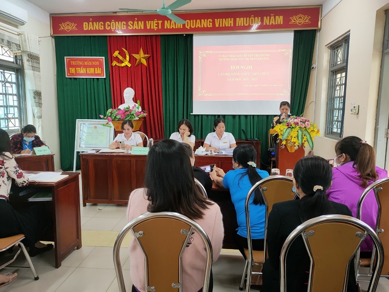 Thực hiện Công văn số 633/GD&ĐT-LĐLĐ ngày 21/9/2021 của Phòng GD&ĐT và LĐLĐ huyện Thanh Oai V/v hướng dẫn tổ chức Hội nghị cán bộ, công chức, viên chức năm học 2021-2022. Sáng ngày 19/10/2021 Trường mầm non Thị Trấn Kim Bài long trọng tổ chức Hội nghị cán bộ, công chức, viên chức năm học 2021 – 2022, nhằm phát huy quyền làm chủ, năng lực sáng tạo của đội ngũ cán bộ, công chức, viên chức trong nhà trường và nhằm thực hiện tốt nhiệm vụ năm học 2021 - 2022. Tại hội nghị cũng đã thực hiện theo quy định phòng chống dịch covid 19 là các cán bộ, giáo viên, nhân viên đến dự hội nghị đều phải quét mã QR, sát khuẩn và đeo khẩu trang và ngồi dãn cách.
