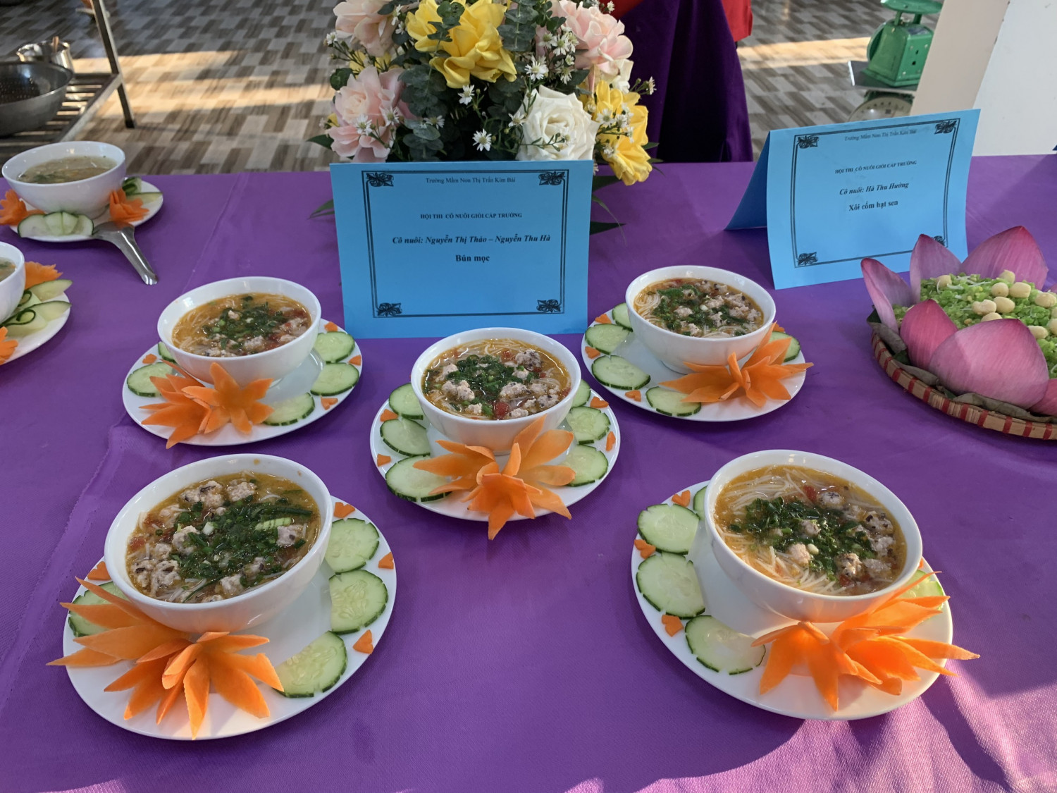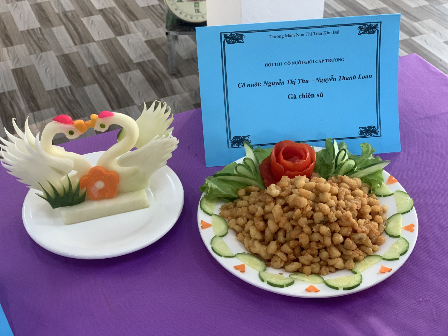 Thực hiện nhiệm vụ năm học 2023- 2024 và kế hoạch tổ chức Hội thi cô nuôi giỏi cấp trường năm học 2023- 2024. Trường Mầm non TT Kim Bài tổ chức Hội thi cô nuôi giỏi cấp trường cho nhân viên nuôi trong nhà trường. Hội thi nhằm đánh giá chất lượng chăm sóc nuôi dưỡng, đặc biệt về việc tổ chức chế độ dinh dưỡng hợp lý cho trẻ tại trường mầm non, đồng thời tạo điều kiện cho đội ngũ nhân viên dinh dưỡng phat huy tính sáng tạo, đúc rút kinh nghiệm, giao lưu, học hỏi lẫn nhau trong việc sử dụng, bảo quản thực phẩm, cách chế biến các món ăn giàu chất dinh dưỡng, đầy đủ và hợp lý trong khẩu phần ăn hằng ngày cho trẻ mầm non. Đây là công việc thường xuyên nhưng có vai trò hết sức quan trọng đối với sự phát triển thể chất cho trẻ, đây cũng là cơ hội để các nhân viên cấp dưỡng thể hiện tài năng, sự khéo léo và hiểu biết về kiến thức vệ sinh an toàn thực phẩm nhằm đáp ứng được yêu cầu ngày càng cao của các bậc cha mẹ trẻ, của ngành học mầm non và toàn xã hội. Theo yêu cầu của Ban tổ chức hội thi đề ra , các cô đã thực hiện xây dựng thực đơn đảm bảo, cân đối, đầy đủ các chất dinh dưỡng, đảm bào lượng calo/ ngày cho trẻ tại trường, mỗi thí sinh với một thực đơn khác nhau, các thực phẩm không bị trùng lặp, thực phẩm tươi ngon, đảm bảo chất lượng và an toàn. Phần thi thực hành các cô đã tìm tòi, sáng tạo, đưa ra các ý tưởng và chế biến được nhiều món ăn mới, có thể sử dụng, áp dụng được trong việc thay đổi thực đơn cho trẻ tại nhà trường. Những món ăn được các cô trang trí đẹp mắt làm tăng thêm độ hấp dẫn của món ăn, tạo cho trẻ hứng thú với món ăn. Với đội ngũ đã có nhiều năm kinh nghiệm nên thực phẩm được các cô lựa chọn rất tươi ngon và đều có sẵn tại địa phương. Dưới bàn tay khéo léo của các cô cộng với quá trình chế biến đảm bảo đúng quy trình vệ sinh an toàn thực phẩm đã trở thành những món ăn ngon, đầy đủ chất dinh dưỡng và phù hợp với lứa tuổi mầm non. Vì độ tuổi này hệ tiêu hóa còn non nên các món ăn phải đạt những yêu cầu như: đảm bảo về số lượng, chất lượng, thức ăn phải nhỏ, mềm, gia vị vừa ăn, sản phẩm hấp dẫn nhằm kích thích trẻ ăn ngon, ăn hết suất. Qua hội thi cho thấy sự quan tâm, sát sao của Ban giám hiệu nhà trường, của các cô nuôi cùng sự ủng hộ nhiệt tình của các bậc phụ huynh về công tác chăm sóc nuôi dưỡng trẻ trong nhà trường, xây dựng trường mầm non TT Kim Bài xứng đáng là một địa chỉ đáng tin để các bậc cha mẹ trẻ yên tâm gửi con tại trường.